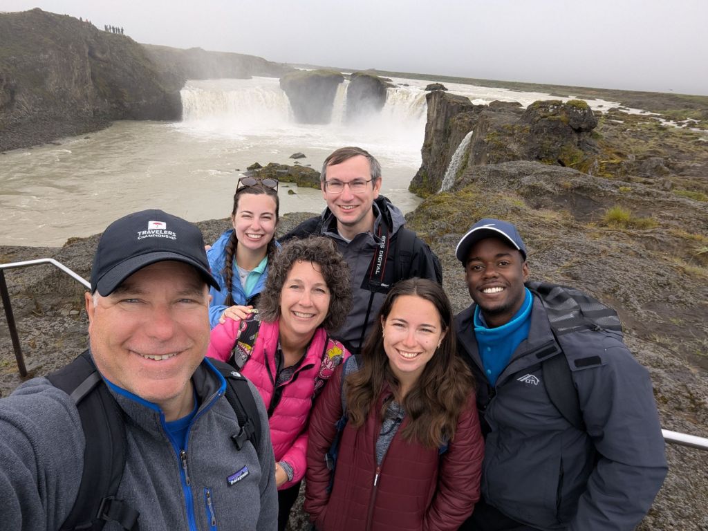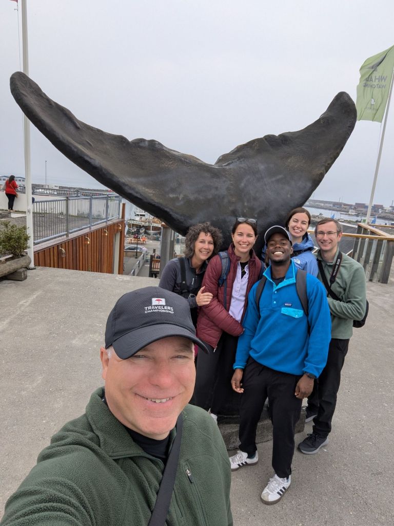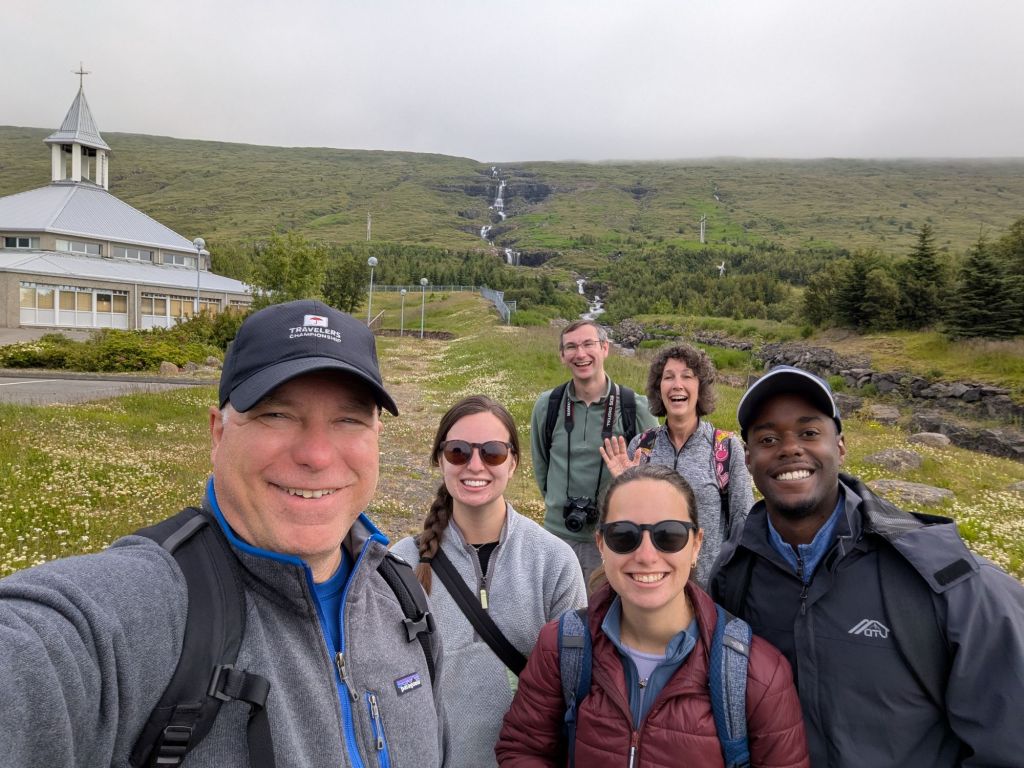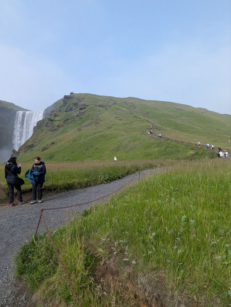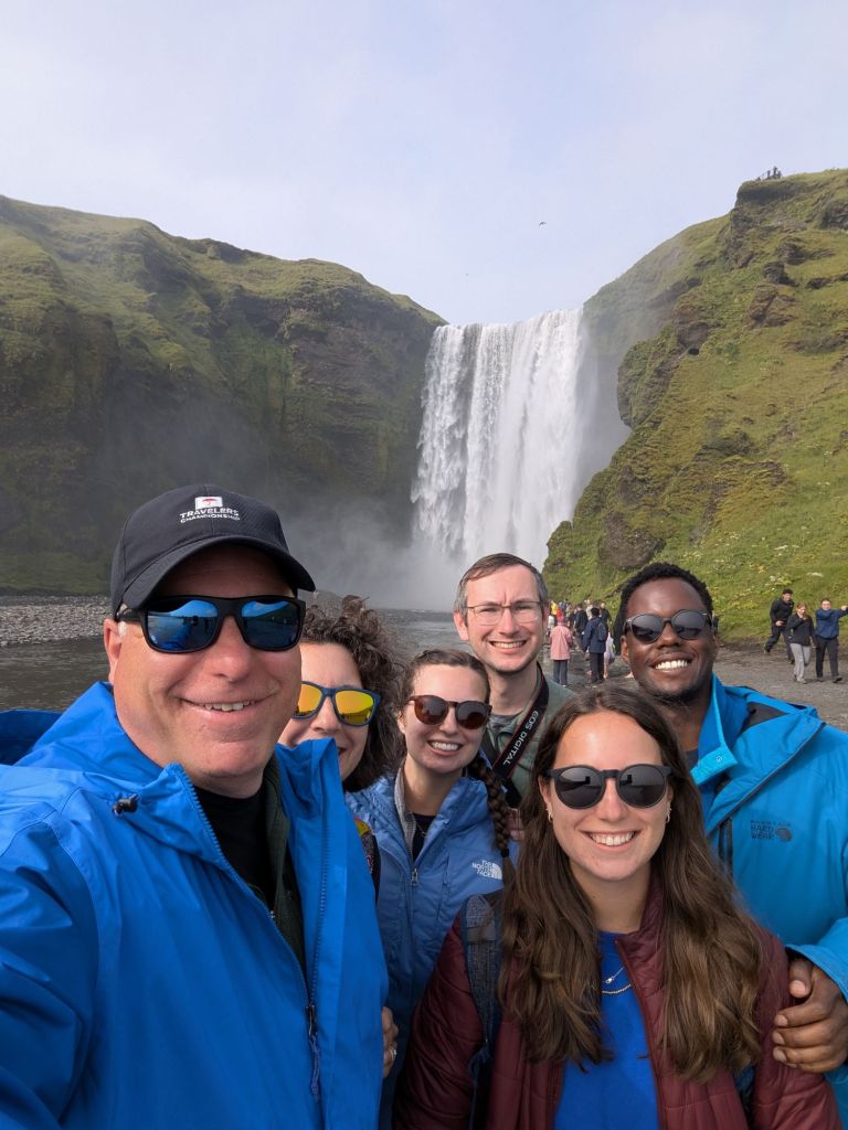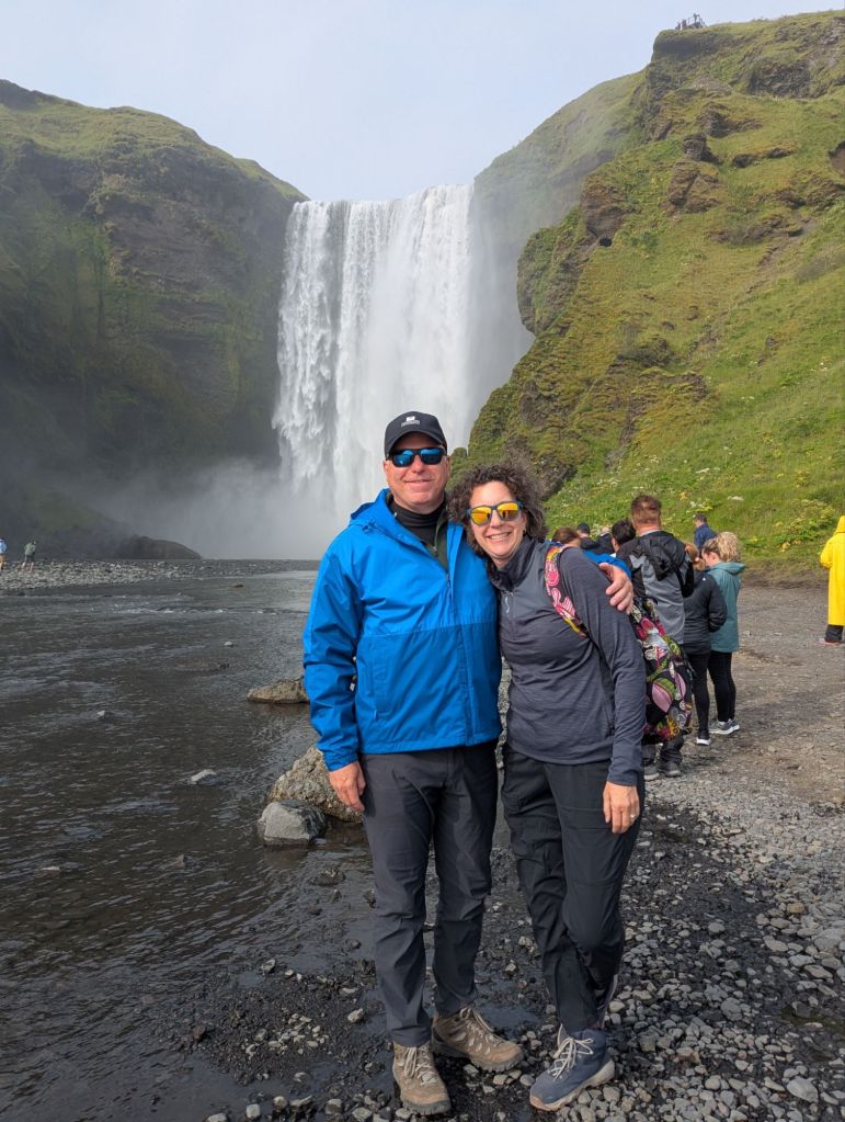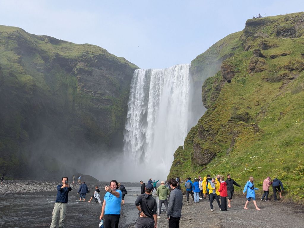 On our way back toward Reykjavík, there was time for one more stop: Skógafoss, often hailed as one of Iceland’s most beautiful waterfalls. Dropping 203 feet in a roaring curtain of water, Skógafoss is fed by runoff from two glaciers. Standing at the base, feeling the mist on our faces, we could see why it’s one of Iceland’s most photographed natural wonders. On sunny days, rainbows often form in the spray – but even without one, the sheer size and sound were awe inspiring.
