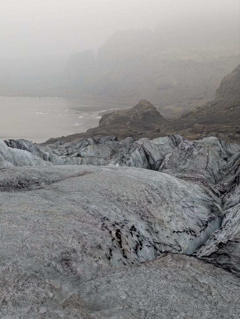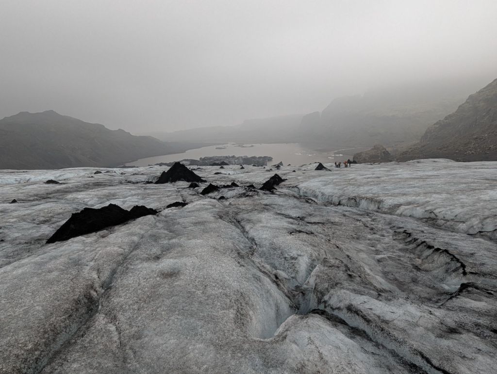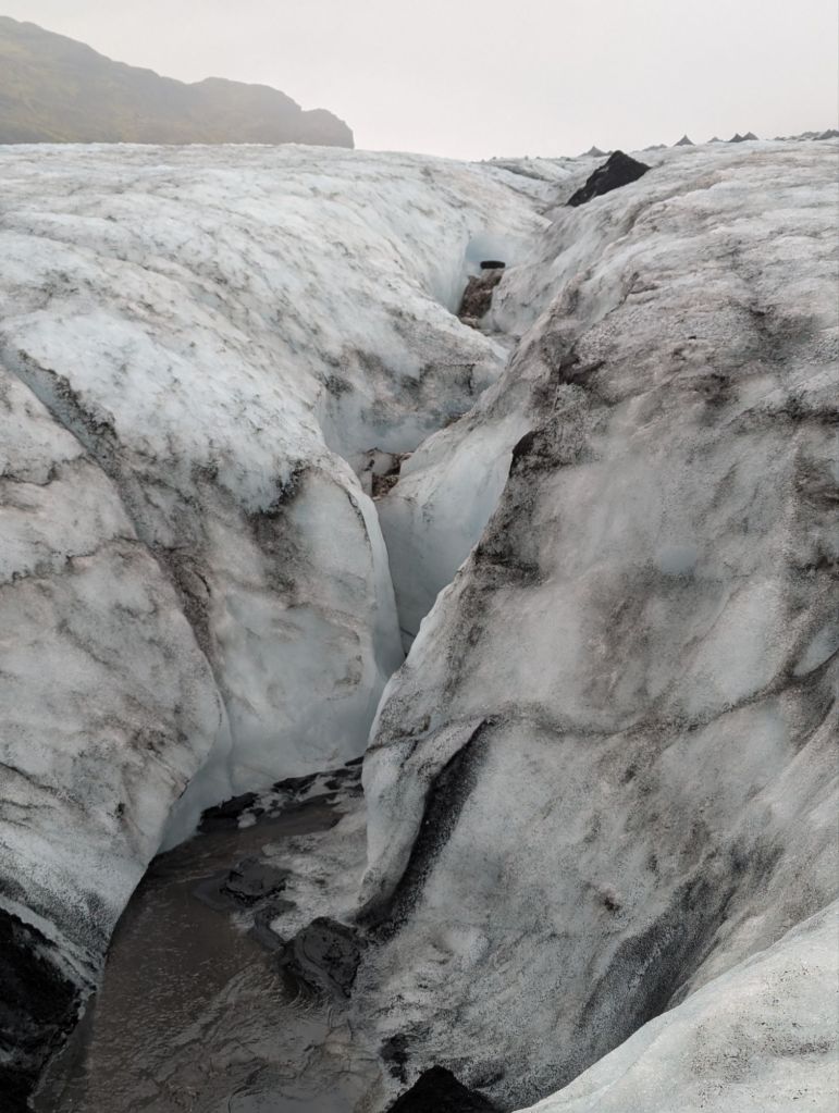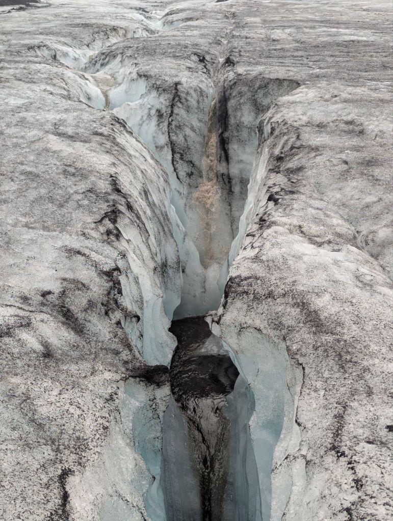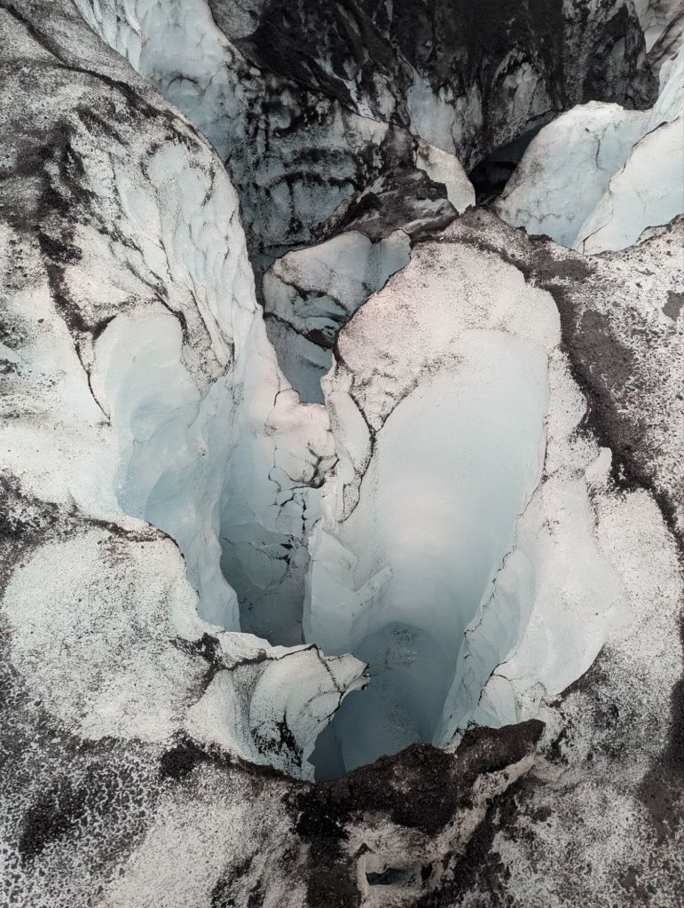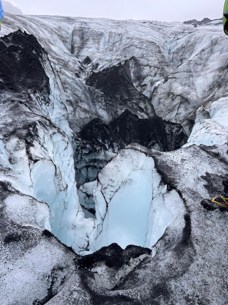 At first glance, the glacier looked like a black-and-white photograph. Volcanic ash from past eruptions streaked the ice with dark layers, but whenever a crevice opened, it revealed stunning shades of blue – pure, compressed ice thousands of years old. In the summer, the glacier is more forgiving, with softer ice for our crampons to grip. We even tasted some freshly melted glacier water, crystal-clear and refreshingly cold.