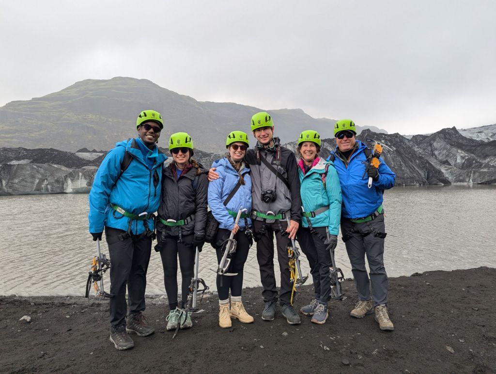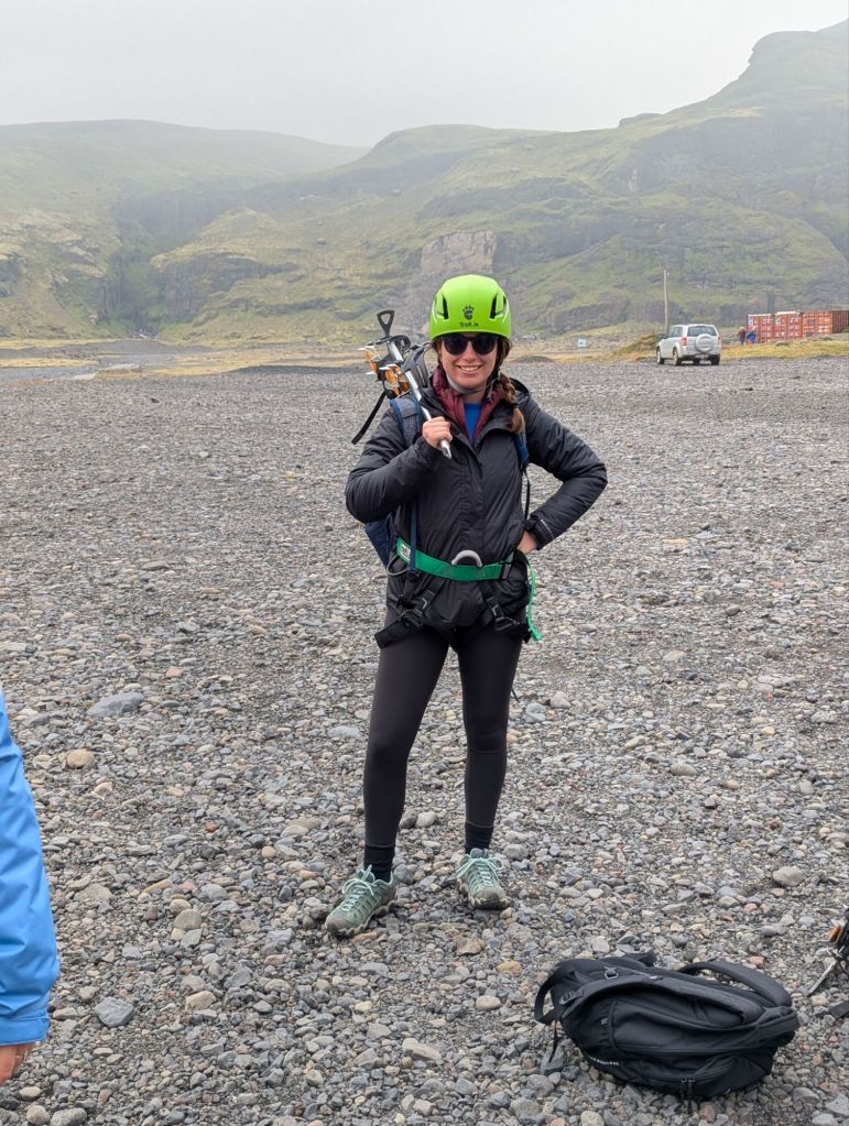 From there, we drove southeast to the day’s highlight: a three-hour hike on Sólheimajökull, an outlet glacier of Mýrdalsjökull – the fourth-largest glacier in Iceland. Outfitted with harnesses, helmets, crampons, and ice axes, we followed our guide onto the frozen expanse.