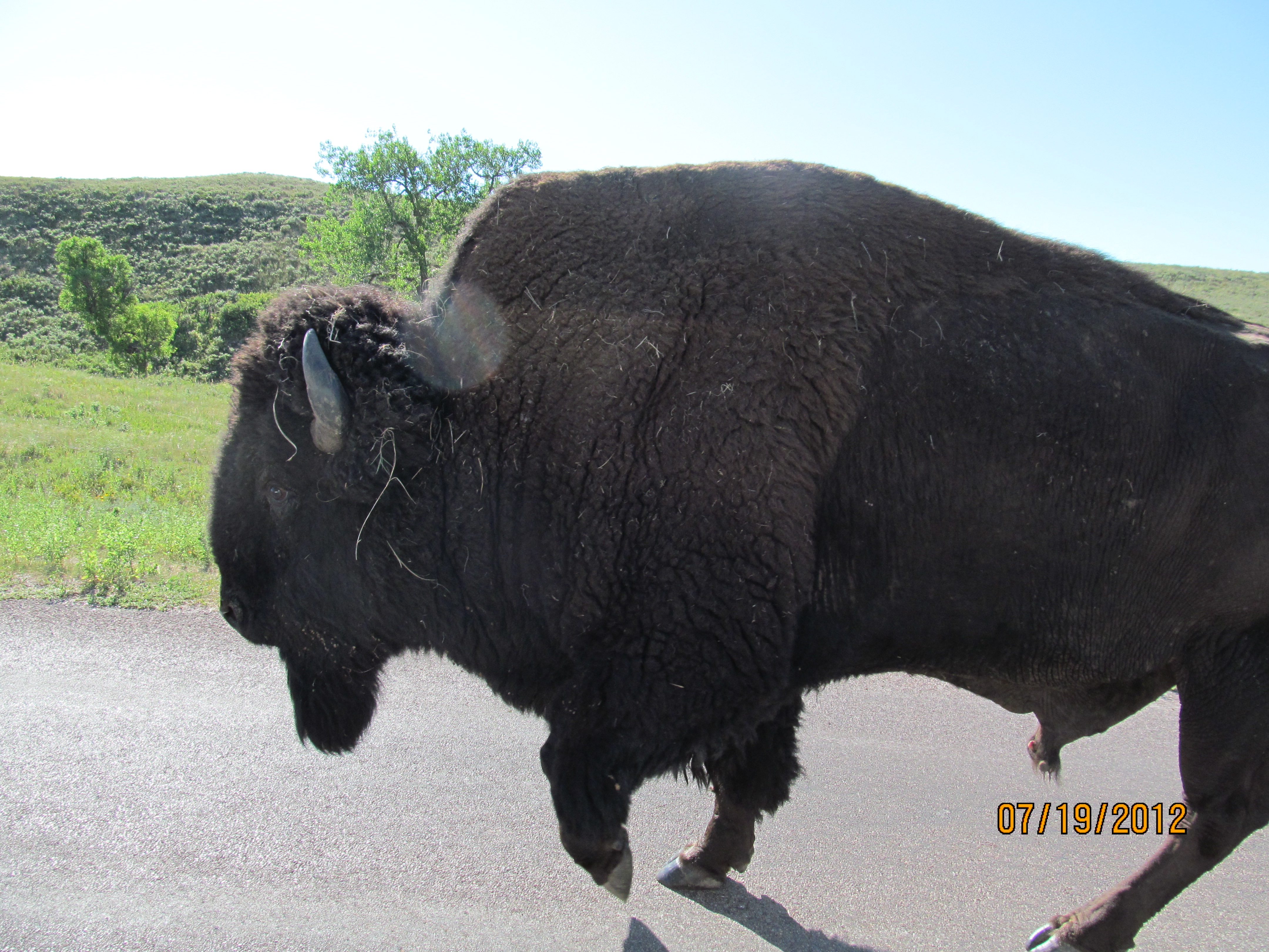 ImageToday was a long travel day from Custer State Park, SD to Cody, WY (411 miles).  We decided to look for some additional wildlife before leaving Custer State Park by driving around the wildlife loop.  During our drive we came across a mule deer, a few pronghorns (similar to antelopes), bison (one which walked right next to our minivan), prairie dogs, burros (one which visited Karen – see the video at ( http://youtu.be/UxwVGypdPRE ) and white-tailed deer.  FYI – Custer State Park has the largest herd of bison in the United States.