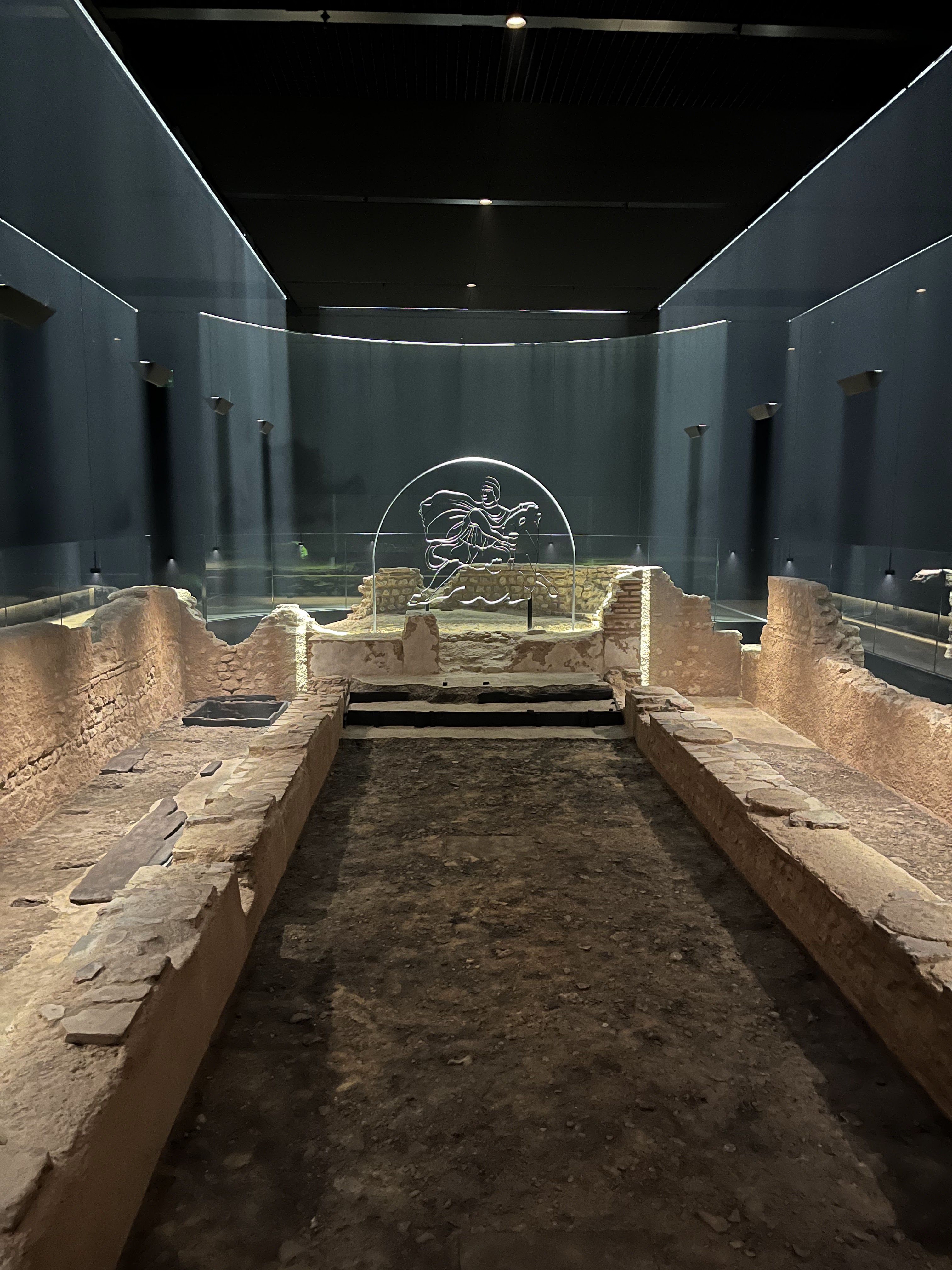 The London Mithraeum ruins, with the image of god Mithras that would’ve been present in the building.