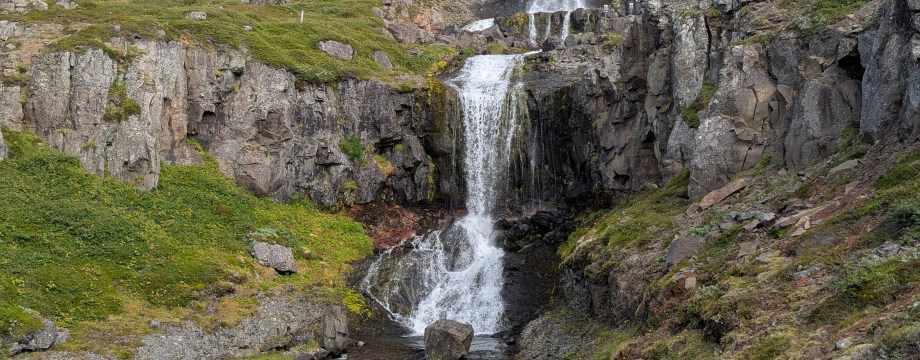 Our morning mission: hike to the top of Bleiksárfoss, a cascading series of waterfalls just a few blocks from the harbor. The trail started out gently, winding its way through the landscape, but soon gave way to steeper, more rugged terrain. Undeterred, our family pressed on, determined to reach the top. And we did, or so we thought we did.