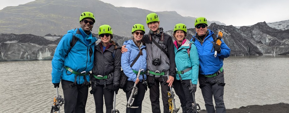 From there, we drove southeast to the day’s highlight: a three-hour hike on Sólheimajökull, an outlet glacier of Mýrdalsjökull – the fourth-largest glacier in Iceland. Outfitted with harnesses, helmets, crampons, and ice axes, we followed our guide onto the frozen expanse.